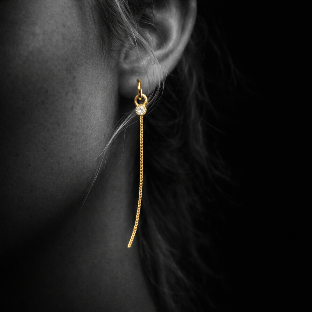 O Tribeca é aquele brinco que muda completamente a tua presença. Minimalista à primeira vista, mas com uma corrente longa que desliza com cada movimento — elegante, feminino e absolutamente magnético. Perfeito para um jantar especial ou para elevar um look simples. Eleva o teu estilo sem esforço.