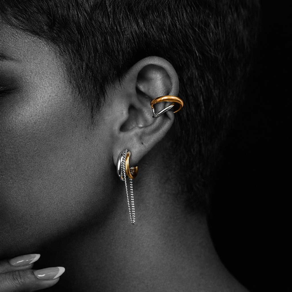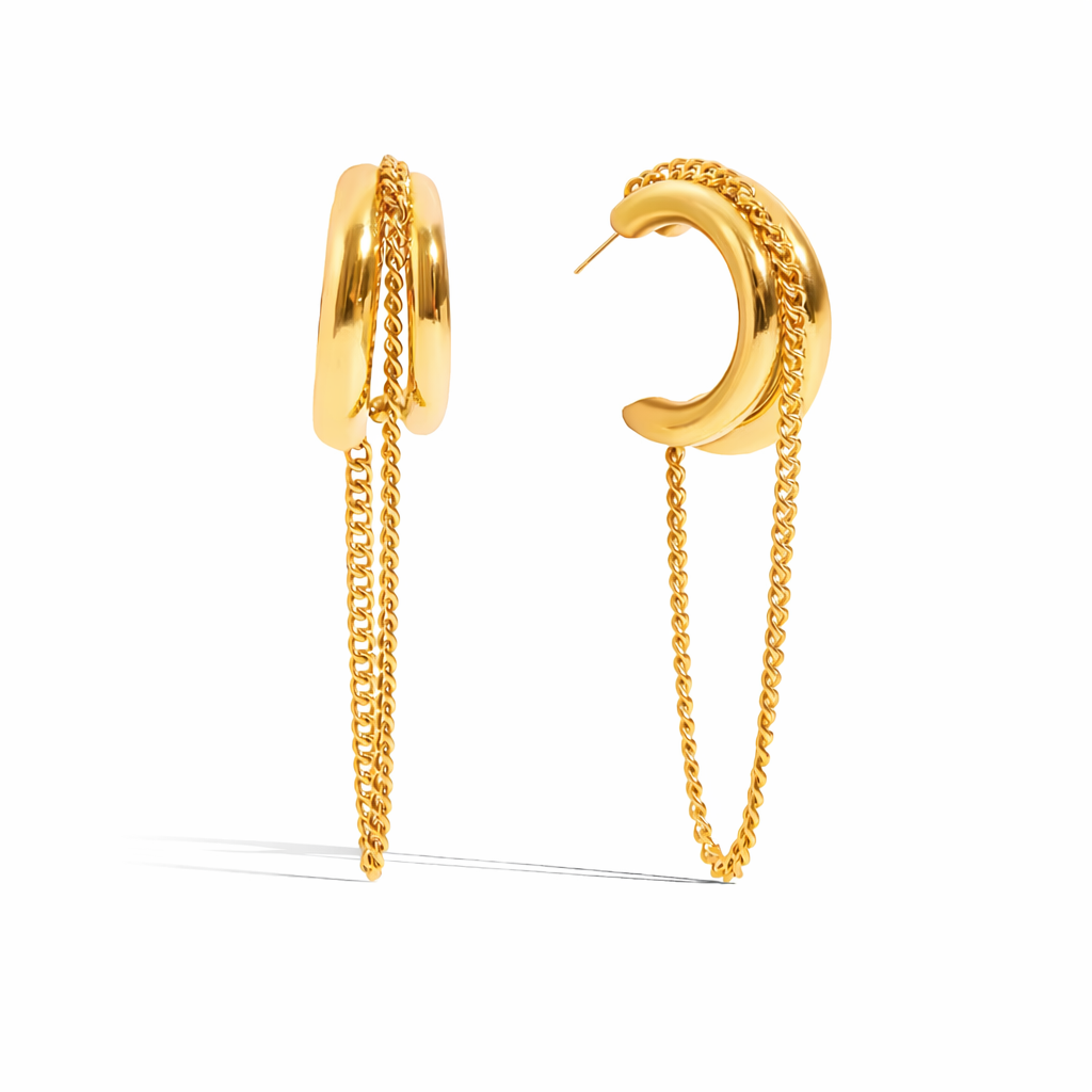 O Mercer é aquele brinco que transforma um look simples em algo marcante. A silhueta robusta combinada com a corrente fluída cria contraste, movimento e presença. Urbano, moderno e absolutamente confiante.